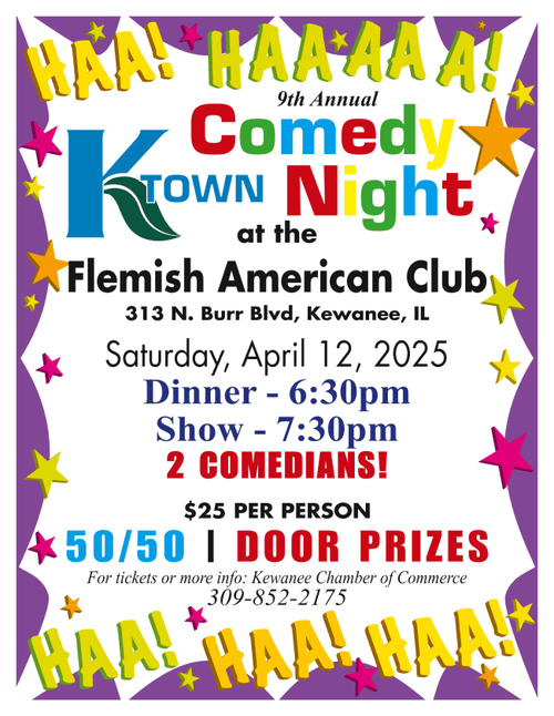 Laughter and a night out are just around the corner as the 9th Annual K-Town Comedy Night returns to Kewanee! This highly anticipated event promises an evening of top-tier entertainment and delicious food, all without the hassle of leaving town. Headlining the show is David Graham, a standout comedian hailing from St. Louis, known for his sharp wit and relatable humor. He’ll be joined by another talented comedian, ensuring non-stop laughs. Gather your friends, secure a table, and make it a night to remember. Tickets are available now at the Kewanee Chamber of Commerce and the Flemish American Club. Don’t wait—grab yours today!