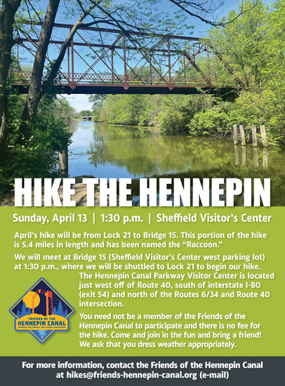 The Hennepin Canal Parkway Visitor Center is located just west off of Route 40, south of Interstate I-80 (exit 54), and north of the Routes 6/34 and Route 40 intersection. If the hike needs to be canceled due to inclement weather, a notice will be posted on their Facebook page.