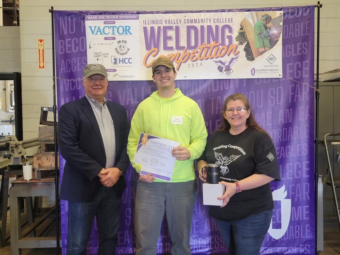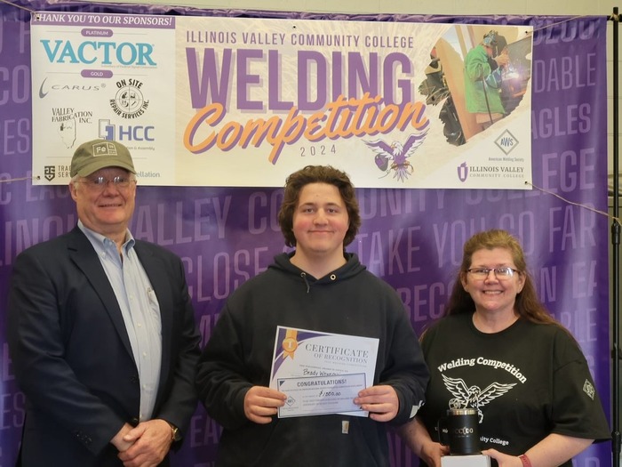 Brady Wawerski, Ottawa, earned first place and prizes in the college SMA welding division at the IVCC-AWS annual welding competition. He is pictured with Theresa Molln (right) and Ron Ashelford,