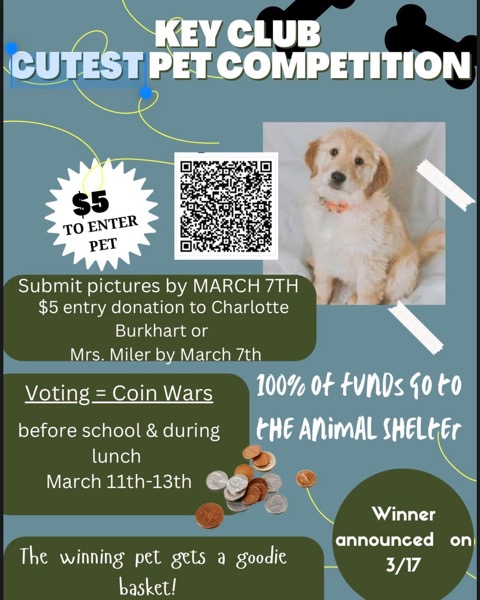 The Key Club is organizing a heartwarming event to benefit the Henry County Humane Society in Kewanee, IL. They’re inviting everyone at the school to join their Cutest Pet Competition. By submitting a pet photo with a $5 donation by March 7th, participants not only showcase their adorable companions but also contribute to a noble cause. Voting takes place during lunch from March 11th to 13th, culminating in the announcement of the winner on March 17th. The lucky winner will receive a delightful goodie basket. All proceeds go directly to support the local animal shelter. Don’t miss this chance to make a difference! Register here.