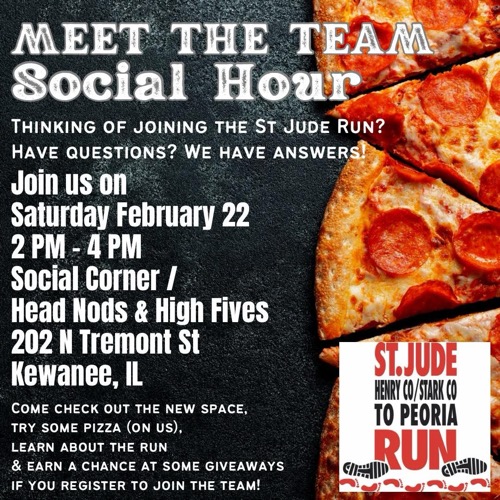 Residents interested in joining the St. Jude Henry and Stark County Run are invited to an information session on Saturday, February 22nd, from 2 PM to 4 PM. The event will be held at Social Corner, located at 202 North Tremont Street in Kewanee. Attendees can enjoy free pizza from Head Nods and High Fives, learn about the run, and register for giveaways upon team registration.