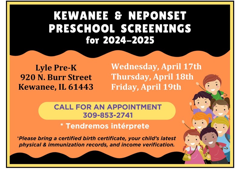 Kewanee and Neponset schools are holding preschool screenings this week at Lyle School in Kewanee for the 2024-2025 school year. All you need to bring with you is a certified birth certificate, current physical and immunization records, and income verification. Call 309-853-2741 to make an appointment. Screenings are conducted Wednesday, Thursday, and Friday, April 17th to 19th. Lyle School is located at 920 N Burr Blvd.