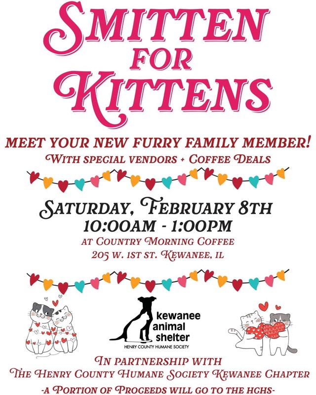 This Saturday, February 8th, the Henry County Humane Society teams up with Country Morning Coffee for a heartwarming kitten adoption event. From 10 AM to 1 PM at 205 West First Street in Kewanee, families can meet adorable kittens in need of loving homes. Alongside the adoption opportunities, special vendors and coffee deals will be on offer, with part of the proceeds benefiting the shelter. It’s a purr-fect chance to grab a cup of coffee, support a great cause, and maybe bring home a new furry friend.