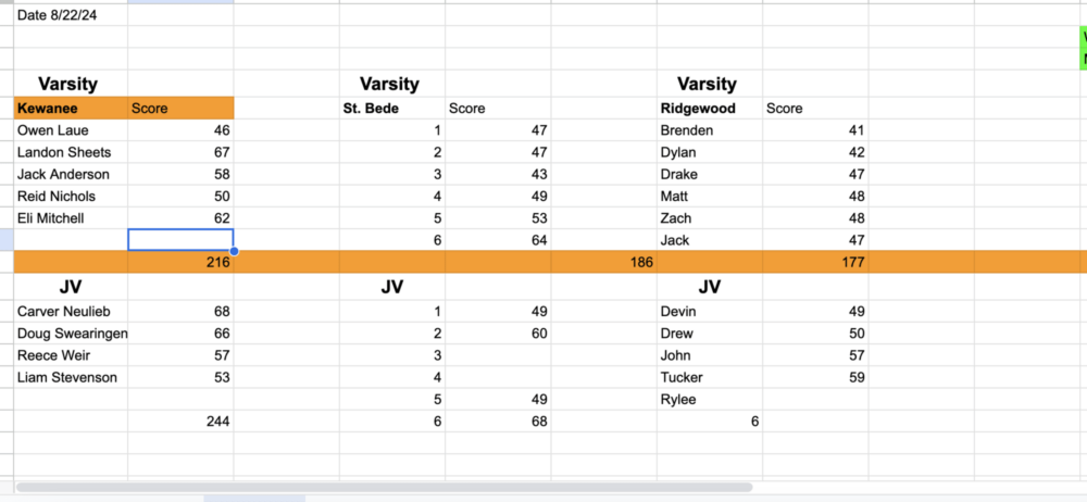 The Kewanee High School Boy’s Golf Team played against St. Bede and Ridgewood on Thursday, August 22, 2024, at Baker Park. Kewanee fell short and took home third place. Ridgewood took first place with a score of 177, St. Bede came in second with 186, and Kewanee took third with 216. Owen Laue shot a 46, Reid Nichols at 50, Jack Anderson at 58, Eli Mitchell at 62, and Landon Sheets at 67 for the varsity team. Liam Stevenson shot a 53, Reece Weir got a 57, Doug Swearingen got a 66, and Carver Neulieb got a 68 for the JV team.