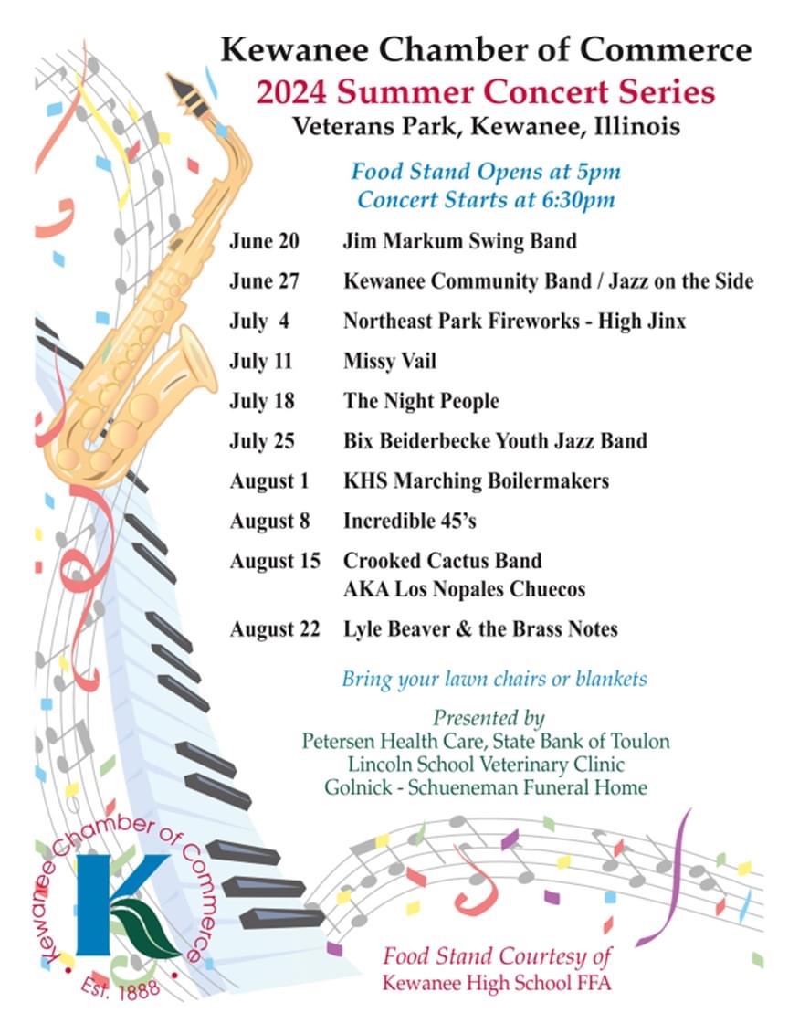 The 28th season of the Kewanee Chamber of Commerce Concerts in the Park begins tonight, June 20, 2024, at 6:30 PM, in Veterans Park. The music starts at 6:30 but the Kewanee High School FFA will start serving grilled food and cold drinks around 5 PM. Admission is free. You don’t want to miss the concerts this summer.