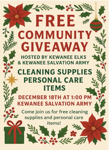 The Kewanee Elks have joined forces with the Kewanee Salvation Army to host a community giveaway of cleaning supplies and personal care items. This event is scheduled for December 18th at the Kewanee Salvation Army at 1 PM. Residents from the area are encouraged to stop by and pick up essential items free of charge. Organizers aim to help individuals and families with basic needs as the holiday season approaches. Supplies will be distributed while they last, and all are welcome. Organizers are encouraging participation, emphasizing their commitment to strengthening community ties and helping neighbors through tough times.