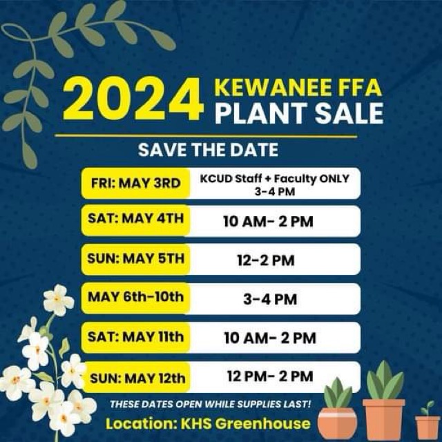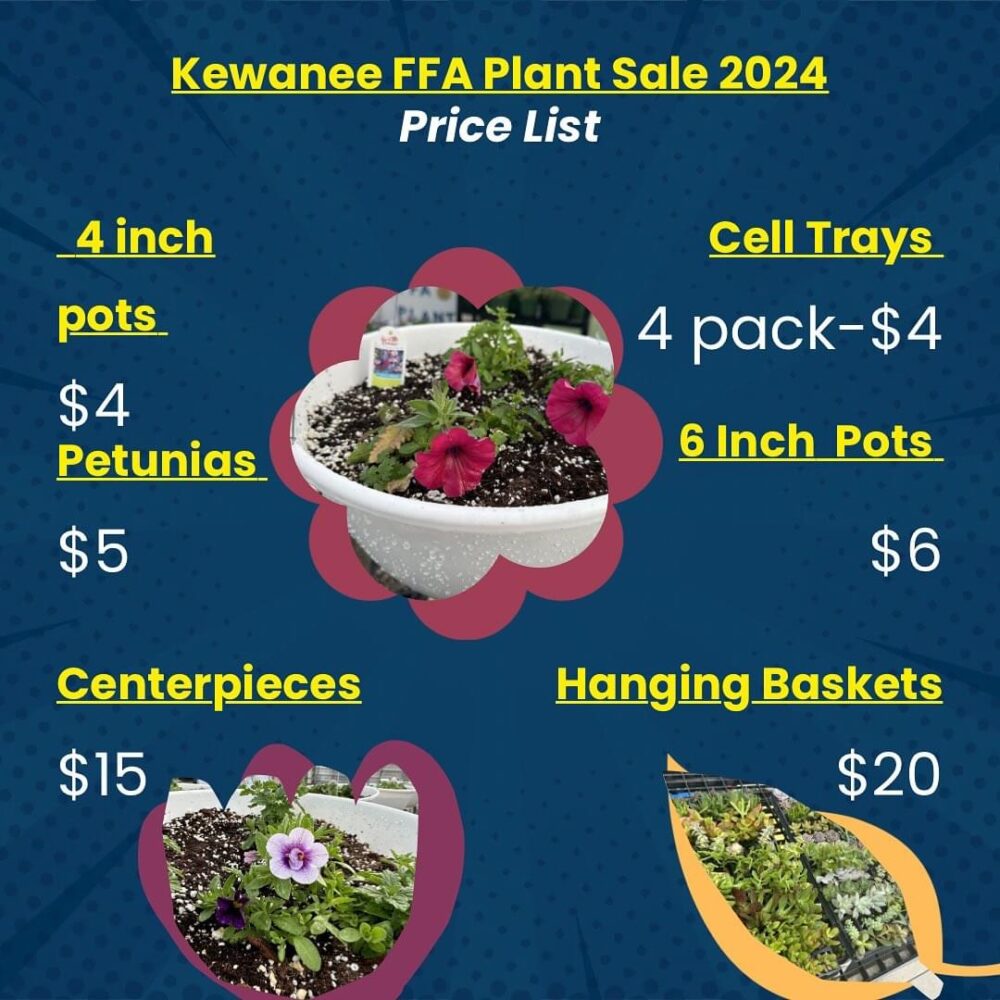 Spring has sprung for Kewanee High School FFA students. The 2024 Kewanee FFA Plant Sale begins today, May 3, 2024, for Kewanee School District staff and faculty only. Plant sales begin on Saturday, May 4th, from 10 AM to 2 PM, for the public at the Kewanee High School greenhouse. A list of plants available for sale and their prices is listed in the graphics below.