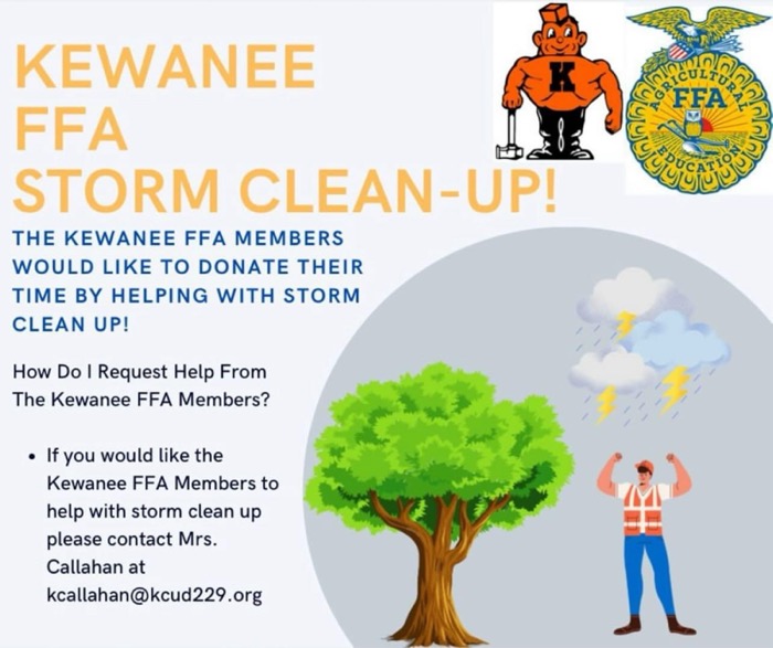 Kewanee FFA students are donating their time to help residents clean up after the storms. If you need help with storm clean up, contact Mrs. Callahan at [email protected]