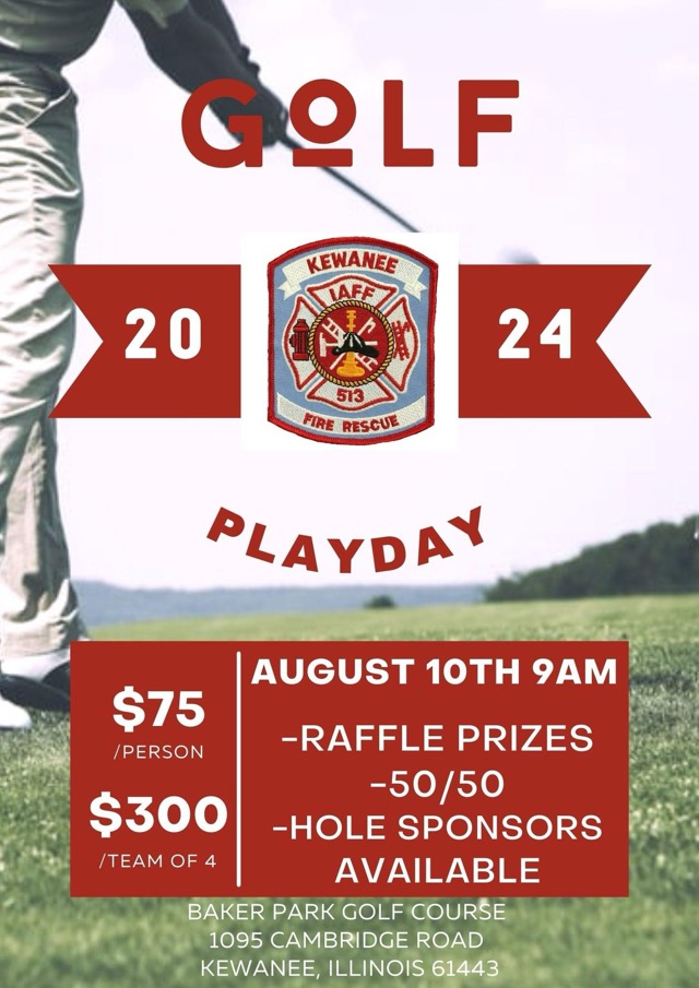 The 12th annual Kewanee Firefighters Local 513 gold play day is on August 10, 2024, at 9 AM, at the Baker Park Golf Course. The entry fee is $75 per person, or $300 for a team of four, and includes a golf cart, greens fees, and a steak dinner following the play day. There will also be raffle items, a 50/50 drawing, an axe putting contest, and more. The money raised from this charity golf play day is donated to local charities throughout the year. If you or your business are interested in hole sponsorship, fill out the form below. You can also sign up to play in the charity golf play day at the link below. If you have any questions, contact Andrew Welgat at [email protected].