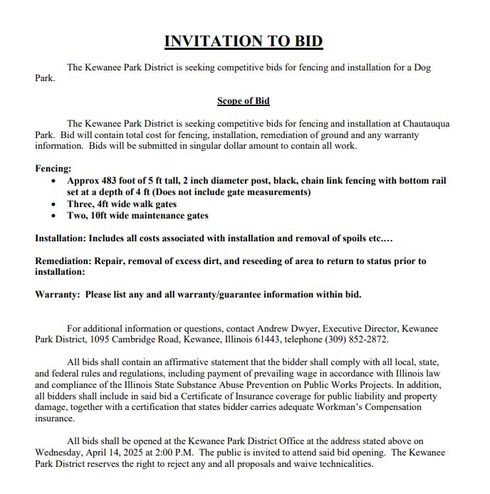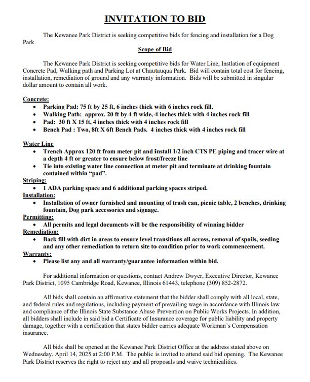 The Kewanee Park District is inviting competitive bids for various improvements at Chautauqua Park. These include fencing, concrete work, water line installation, and the installation of park amenities. Bidders must comply with all regulations and provide necessary insurance certifications. Contact Andrew Dwyer for more details at 309-852-2872. Bids will be opened on April 14, 2025, at 2 PM. The public is invited to attend the bid opening at the Park District Office, located at 1095 Cambridge Road.