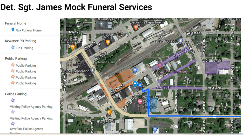 The map link shows designated parking areas at Rux Funeral Home in Galva for the Kewanee Police Department (KPD), the public, family, and visiting police and fire agencies: https://www.google.com/maps/d/edit.