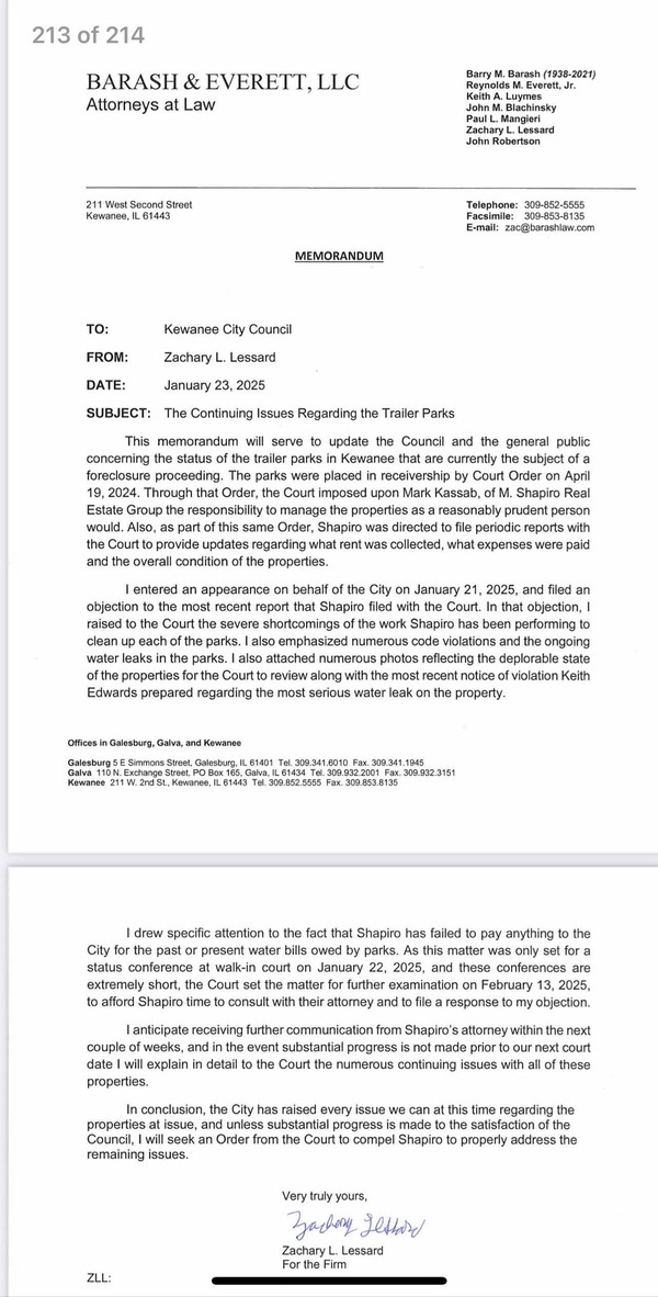 In Kewanee, the future of local trailer parks hangs in the balance as they remain under receivership, a situation that has been ongoing since April 2024. Concerns have deepened with recent objections filed by City Attorney Zachary Lessard, pointing to numerous code violations and substantial unpaid city water bills of over $300,000. These issues indicate a broader struggle to maintain living standards and meet municipal requirements. The next court hearing is set for February 13th, which is expected to determine the next steps toward rehabilitation or possible closures and allow the Shapiro Group time to consult with counsel. These developments raise critical questions about the management and sustainability of such communities. Keith Edwards said at a recent council meeting that he is not pleased with the cleanup efforts by the contractor hired to clean up the trailer parks. He said he had reached out to the Shapiro Group to discuss the issues.