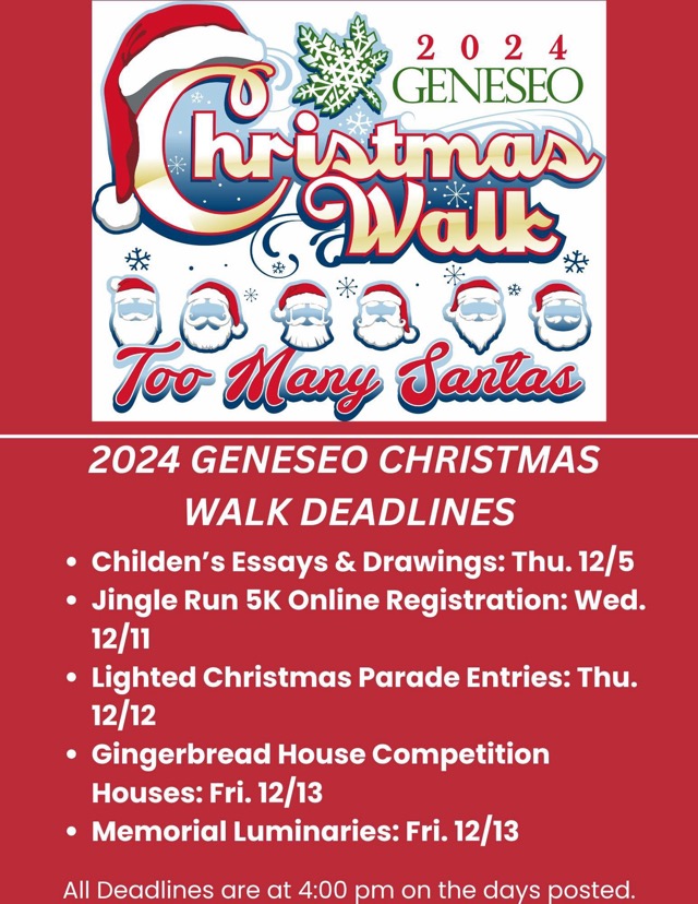 The festive spirit is set to take over Geneseo with the annual Christmas Walk just around the corner! Participants eager to showcase their holiday cheer should note the upcoming deadlines. Children’s essays and drawings are due by December 5th, ensuring young imaginations spark the Yuletide joy. For fitness enthusiasts, the Jingle Run 5K registration wraps up on December 11th. Don’t miss the chance to enter the lighted parade by December 12th, and remember, gingerbread house competitors and memorial luminaries have until December 13th at 4:00 PM to submit their entries. Mark your calendars and let the holiday spirit commence!
