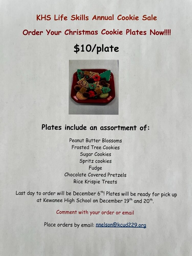 Kewanee High School Life Skills Class is hosting its annual Christmas cookie sale. For $10 per plate, you can enjoy a variety of treats, including Peanut Butter Blossoms, Frosted Tree Cookies, and more. The deadline to place orders is December 6th, with pickup available on December 19th and 20th. Order by email at [email protected] or on the Facebook post here.
