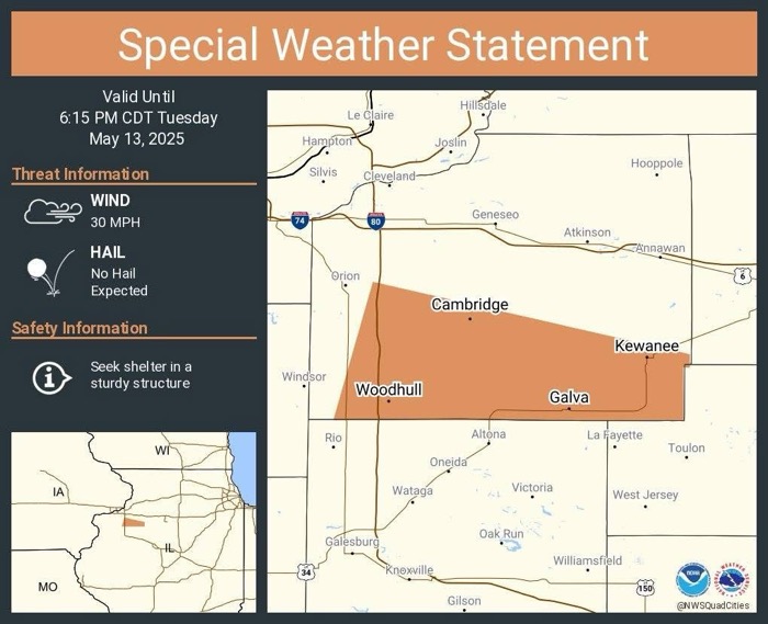 Reports are coming in to the National Weather Service for funnel clouds and landspouts in west-central Illinois this evening. Storms have developed roughly along a line stretching from Henry County southeast through the Wyoming, Illinois area. Observers in these communities have spotted brief, rotating columns extending from the ground into the air. The storms responsible for these funnels are expected to be short-lived. While landspouts are weaker than tornadoes, they can still cause localized damage and injuries.