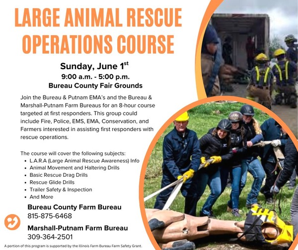 A large animal rescue operations course will be held at the Bureau County Fairgrounds in Princeton on June 1, 2025, at 9 AM. This eight-hour training is specifically designed for fire, police, EMS, and related crews, focusing on the safe and effective rescue of large animals such as horses, cows, pigs, sheep, llamas, and alpacas. While all species are discussed, the main demonstrations will feature horses and cows. Participants will receive classroom instruction, practice haltering drills, learn rescue drag and glide methods, perform trailer safety inspections, and try their hands at simple vertical lifts—equipping them for animal emergencies in the field. Attendees are expected to leave with valuable knowledge to improve safety for both rescuers and animals.