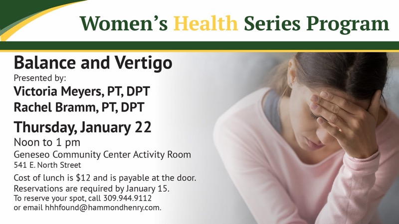 Listeners interested in understanding balance and vertigo are invited to attend the January Hammond-Henry Foundation Women’s Health Series, featuring physical therapists Victoria Meyers, PT, DPT, and Rachel Bramm, PT, DPT. The session covers causes, symptoms, and available treatments, providing valuable insights into these conditions. The event is scheduled for January 22nd, from noon to 1 PM at the Geneseo Community Center Activity Room, 541 East North Street. For those wishing to participate or enjoy lunch for $12, reservations must be made by January 15th. To secure a spot or get more information, call 309.944.9112 or email [email protected]. Don’t miss this chance to learn from experts and take steps toward better health and wellness regarding balance and vertigo concerns.
