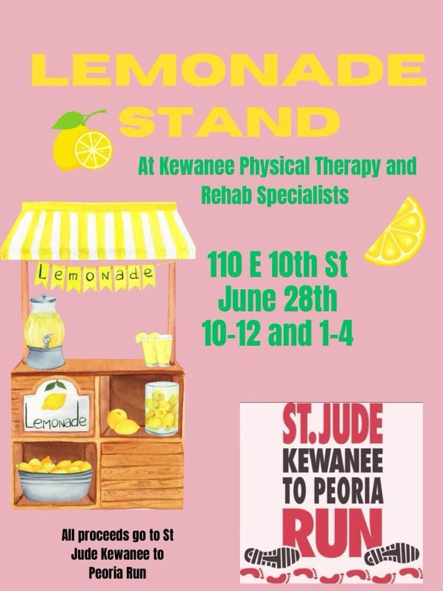 If you love lemonade and want to help the St. Jude Kewanee to Peoria Run, there will be a lemonade stand on Friday, June 28. 2024, from 10 AM to noon and 1 to 4 PM, at Kewanee Physical Therapy and Rehab Specialists, located at 110 East 10th Street in Kewanee. All proceeds go to the St. Jude Kewanee to Peoria Run.