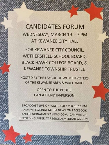 A candidates forum will be held at Kewanee City Hall featuring candidates for the Kewanee City Council, Wethersfield School Board, Black Hawk College Board, and Kewanee Township Trustee on Wednesday, March 19th, at 7 PM. Hosted by the Kewanee Area League of Women Voters and Regional Media, it will be open to the public, broadcast on 1450 AM and 102.1 FM, and streamed online. For ballot details, visit henrycty.com.