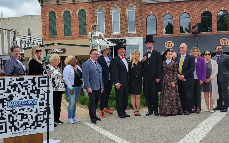 MACOMB, IL – Hundreds gathered on the Macomb Downtown Square this afternoon to celebrate Monopoly inventor Lizzie Magie’s birthday with an unveiling ceremony for Macombopoly, Macomb’s newest attraction, presented by Visit Unforgettable Forgottonia, which serves as the Macomb Area Convention and Visitors Bureau.