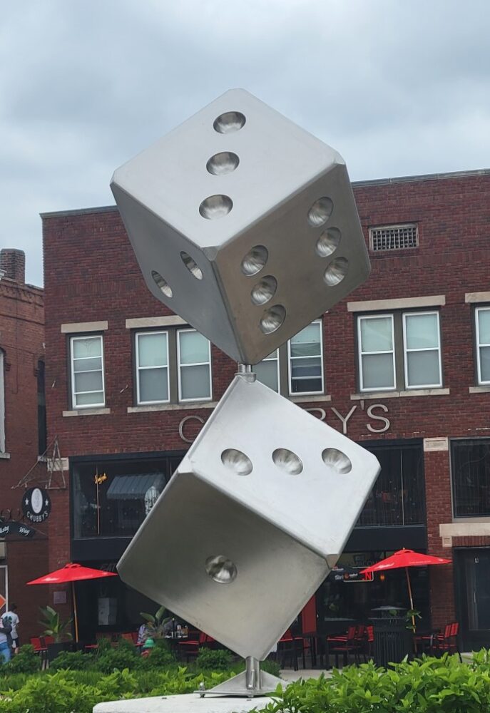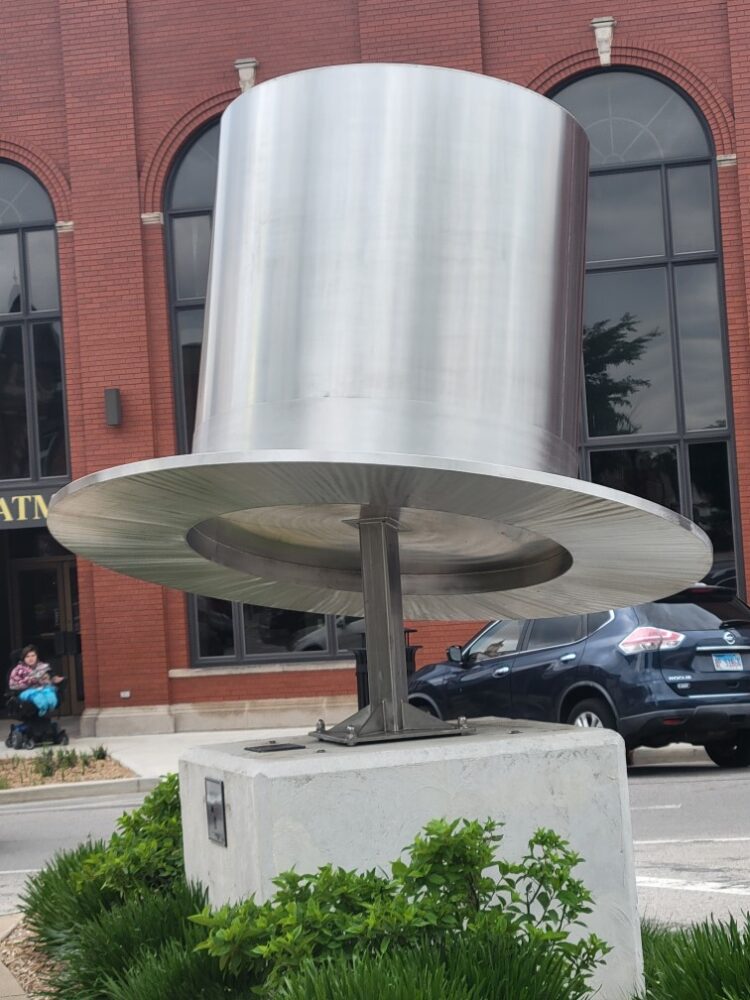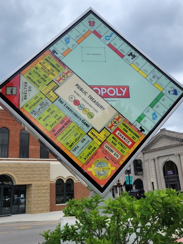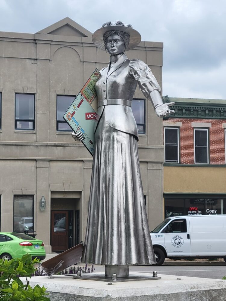 In addition to the app, sculptures crafted by local artisan Gabe Stevens stand at the inner four corners of the square, representing Magie, a pair of dice, an Abe Lincoln-styled stovepipe hat, and a a giant mockup of Lizzie’s original game, The Landlord’s Game, juxtaposed in part on one side against a modern representation of a Monopoly board.. Magie invented the Landlord’s Game to educate players about the pitfalls of capitalism. The game would later be co-opted by Charles Darrow, who gave it the Monopoly moniker before selling the copyright to Parker Brothers.