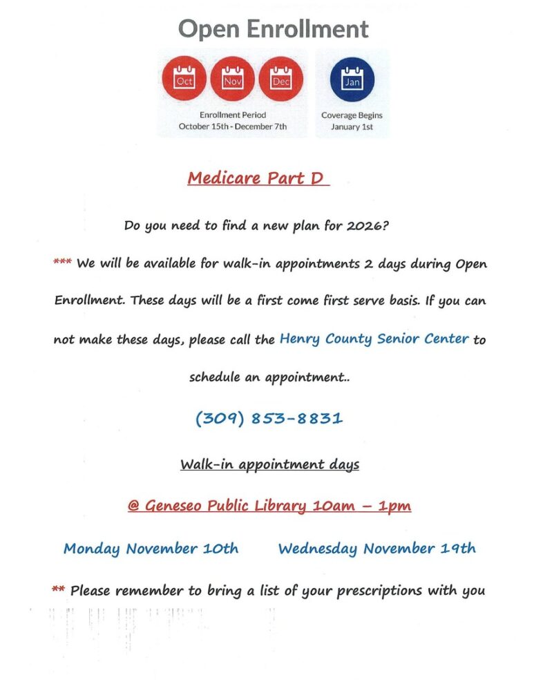 Medicare Part D open enrollment is underway, giving beneficiaries the chance to review and update their prescription drug coverage for the coming year. The enrollment window continues through December 7th, with any changes taking effect January 1, 2026. Residents seeking assistance can stop by the Geneseo Public Library for walk-in appointments on November 10th and November 19th, from 10 AM to 1 PM. Experts will be on hand to answer questions and help with paperwork. For more details or to schedule a different appointment time, individuals are encouraged to reach out to the Henry County Senior Center at 309-853-8831. Act soon to take full advantage of this annual opportunity.