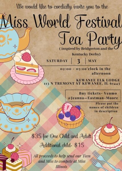 The Miss World Festival, inspired by Bridgerton and the Kentucky Derby, will take place on Saturday, May 3rd, from 2:00 to 5:00 in the afternoon at the Kewanee Elk Lodge, located at 113 North Tremont Street in Kewanee. Tickets are $35 for one child and adult, with additional children at $15. Proceeds will support Teen and Miss contestants competing at the Miss Illinois Pageants. Purchase tickets via Venmo to Jeanna-Eastman-Moore, including children’s names in the Venmo description.