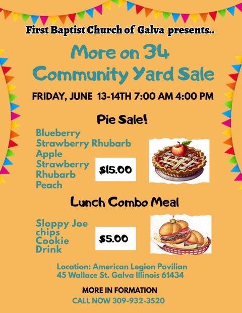 The First Baptist Church of Galva is hosting a “More on 34” community yard sale and pie sale at the American Legion Pavilion on Wallace Street in Galva. Homemade pies are available for $15 each, featuring a variety of flavors. Visitors can also enjoy lunch combo meals, priced at $5. This event presents a great opportunity to browse for unique treasures, satisfy your sweet tooth, and enjoy lunch—all while supporting community initiatives. For more information on the event or how you can get involved, call 309-932-3520. Don’t miss out on this chance to connect with neighbors and enjoy homemade treats.