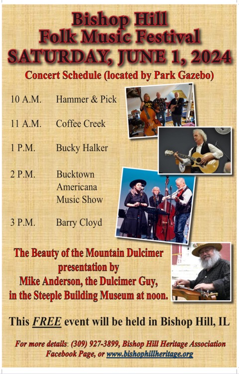 The Folk Music Festival morning concerts for Saturday, June 1, 2024, are being moved into the Colony School due to the weather forecast in the morning. Hammer & Pick will perform at 10 AM and Coffee Creek will perform at 11 AM. The concerts scheduled for Saturday afternoon will still be in the park. The Mountain Dulcimer program will remain in the Steeple Building Museum at noon. The Colony School is located at 405 West Main Street, two blocks west of the park. If there are any questions, please contact the Bishop Hill Heritage Association at [email protected] or call 309-927-3899.