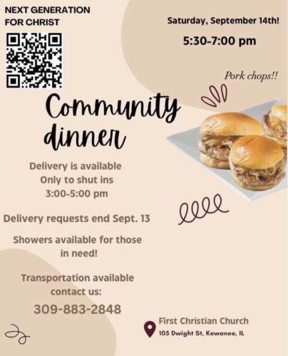 The talented high school students from Wethersfield School that started the ‘Next Generation for Christ‘ are hosting a Community Dinner on Saturday, September 14, 2024, from 5:30 to 7 PM. The dinner will be at the First Christian Church, 105 Dwight Street, and pork chops, sides, and dessert are on the menu! The food is free, and showers are available to anyone in need. Transportation is available by calling 309-883-2848. If you are unable to leave your home and need a hot meal, call 309-883-2848 by September 13th to arrange for meal delivery.