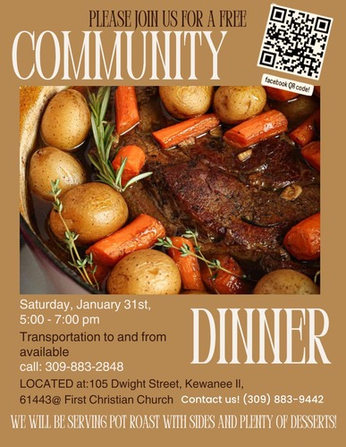 Neighbors in Kewanee are invited to a free community dinner by the Next Generation for Christ on Saturday, January 31st, at First Christian Church at 105 Dwight Street. The event welcomes everyone from 5 to 7 PM, offering pot roast, a selection of sides, and tempting desserts—all at no cost. Organizers aim to bring residents together for an evening of food and fellowship, and transportation can be arranged for those needing a ride. Attendees are encouraged to call 309-883-2848 for details or to request transportation. Whether attending alone or with family, all are welcome to share a meal and connect with the community.