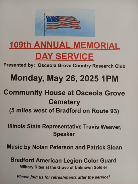 The Osceola Grove Country Research Club will host the 109th annual Memorial Day service at the Community House near Osceola Grove Cemetery on May 26, 2025, at 1 PM, five miles west of Bradford on Route 93. Illinois State Representative Travis Weaver will speak. Attendees can expect musical performances by Nolan Peterson and Patrick Sloan and a traditional color guard presentation to honor those who served. The ceremony will conclude with military rites at the Grave of the Unknown Soldier, offering a poignant reminder of the day’s significance. This longstanding tradition draws community members together in solemn remembrance and gratitude.