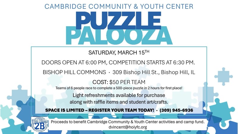 The Cambridge Community & Youth Center will host a Puzzle Palooza at Bishop Hill Commons in Bishop Hill at 6:30 PM. Teams of six will compete to complete a 500-piece puzzle. Entry costs $50 per team, with proceeds benefiting community activities and a camp fund. Registration is required. To register, call 309-945-6936 or email [email protected] for more information.