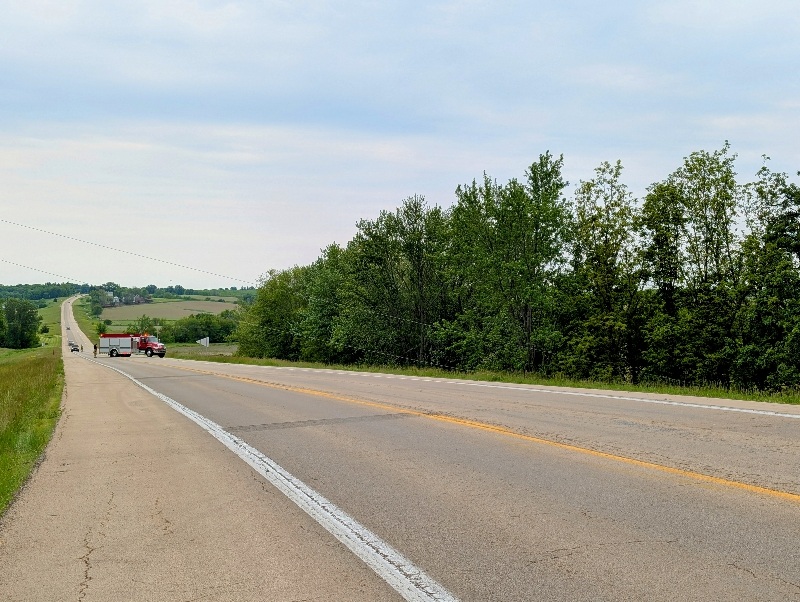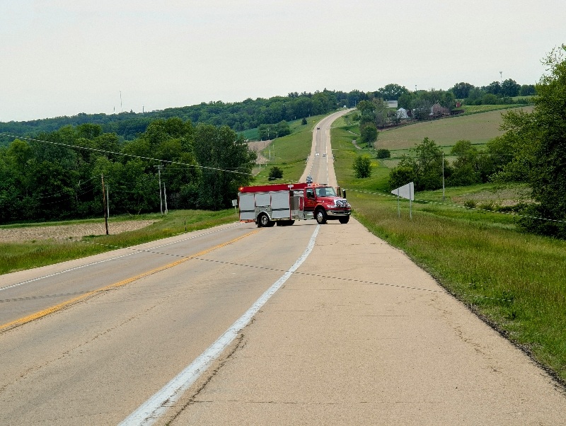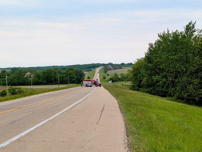 Update at 3 PM: Highway 78 is back open. Power has been restored to all but one house. Cornbelt is working to replace the pole and restore power to the one house. They said the plan is to have power back before dark. They believe the pole snapped in its own, likely due to age.