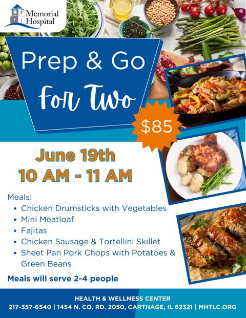 Memorial Hospital’s Health & Wellness Center is bringing back its PREP & GO Meal Workshop on Thursday, June 19, 2025, from 10 to 11 AM. Participants can look forward to preparing five nutritious meals—including Chicken Drumsticks with Veggies, Mini Meatloaf, Fajitas, Chicken Sausage & Tortellini Skillet, and Pork Chops with Potatoes and Green Beans—under the guidance of Registered Dietitians Ashlyn Housewright and Julie Shoemaker. Each meal serves two to four people, perfect for busy households. The cost is $85, and with only 15 spots available, registration is filling fast at MHTLC.ORG or 217-357-6540.