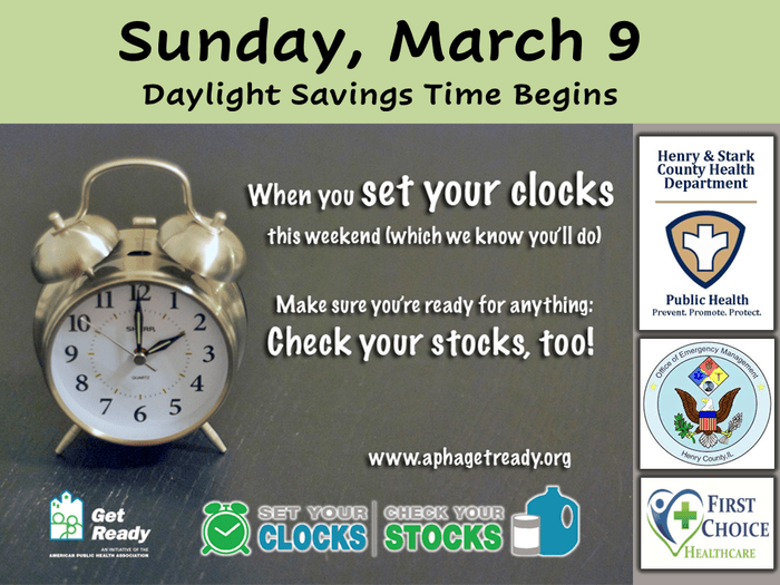 As the clock change approaches with daylight saving time kicking in this Sunday, March 9th, the Henry & Stark County Health Departments, along with the Office of Emergency Management, are urging residents to take action. Part of the “Get Ready: Set Your Clocks, Check Your Stocks” campaign by APHA, this effort encourages everyone to review and update their emergency preparedness stockpiles. Ensure food, water, and supplies are adequate, and nothing is missing or expired. Additionally, it’s the perfect time to check your smoke alarm batteries. For more on emergency preparedness tips, visit ready.gov/kit. Stay prepared and safe this coming season.