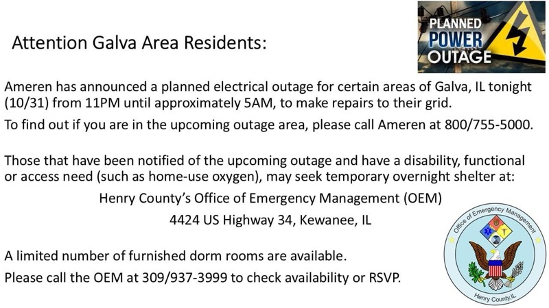 Tonight, residents in certain areas of Galva will experience a planned power outage from 11 PM to approximately 5 AM as Ameren undertakes essential repairs to their electrical grid. For those unsure if their address is affected, Ameren encourages you to call their helpline at 800-755-5000 for clarification. In response to the outage, Henry County’s Office of Emergency Management is offering temporary overnight shelter at 4424 US Highway 34, Kewanee, for residents who rely on electricity for medical equipment or have other special needs. To reserve a spot or inquire about space availability, please contact the OEM at 309-937-3999.