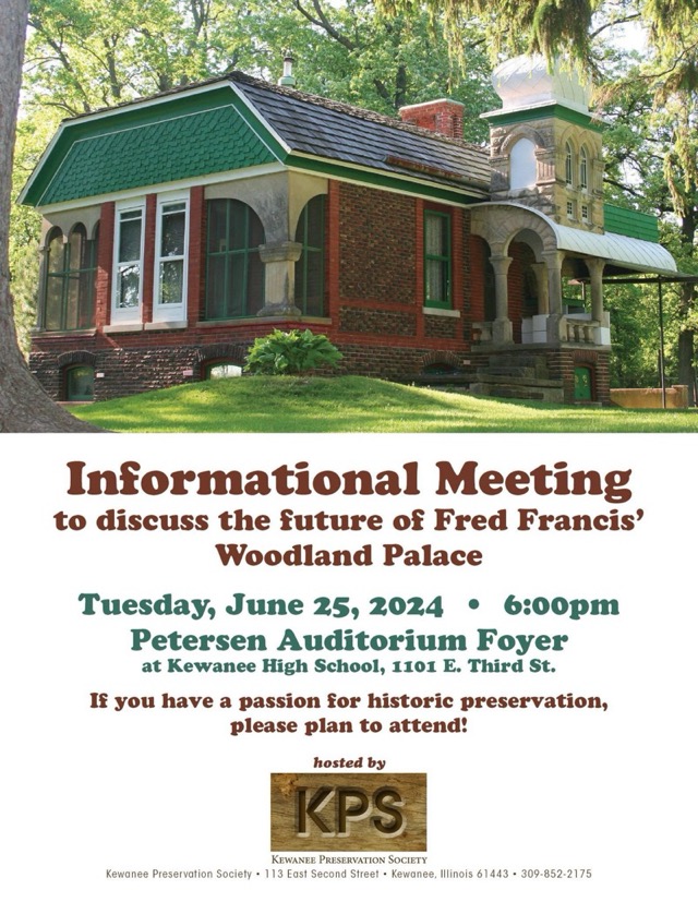 The Kewanee Preservation Society has partnered with the City of Kewanee to find ways to repair, renovate, and maintain the historic Fred Francis Home, known as the Woodland Palace, in Francis Park in rural Kewanee. A public meeting will be held, tonight, June 25, 2024, at 6 PM, to discuss the future of Woodland Palace and form a private sector committee that is dedicated to the renovation and maintenance of Woodland Palace.