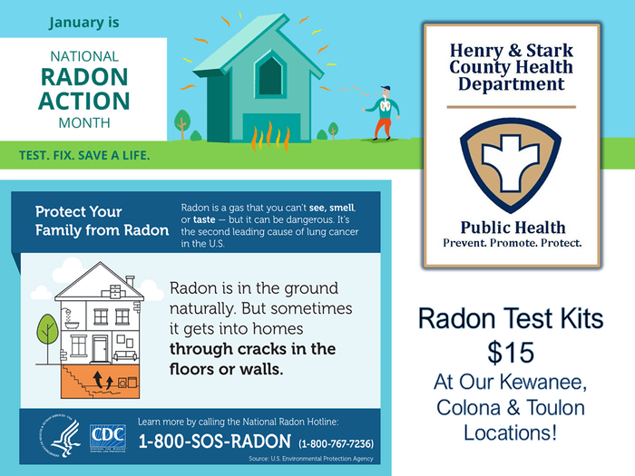 This January, in recognition of National Radon Action Month, the Henry and Stark County Health Departments are raising awareness about the dangers of radon gas, a colorless, odorless radioactive substance linked to lung cancer, estimated to cause 21,000 deaths annually. Found in 66% of homes in Henry County and 92% in Stark County, radon emanates from natural uranium decay in the soil. Health Promotion Director RaeAnn Tucker emphasized the prevalence of radon in all types of homes across Illinois. Residents are urged to test their homes using radon detection kits now available for $15 at the Henry and Stark County Health Department offices and First Choice Clinics in Kewanee, Colona, and Toulon. If radon levels, above the U.S. Environmental Protection Agency’s (USEPA) action level of 4 picocuries per liter of air (pCi/L), are detected in your home, the Health Department can provide you with information regarding radon mitigation on our website at www.henrystarkhealth.com.