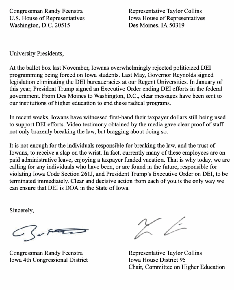 HomeNewsLocalQuad CityIs DEI Really DOA in Iowa?: University Employees in Violation of Anti-DEI Laws Should Be Fired, Two Lawmakers SayIs DEI Really DOA in Iowa?: University Employees in Violation of Anti-DEI Laws Should Be Fired, Two Lawmakers SayFri, September 5, 2025 by River Cities' ReaderSHARE NOW Two GOP lawmakers at the state and federal level are calling on public university leaders to fire anyone found to have violated laws banning diversity, equity, and inclusion in college classrooms and beyond.