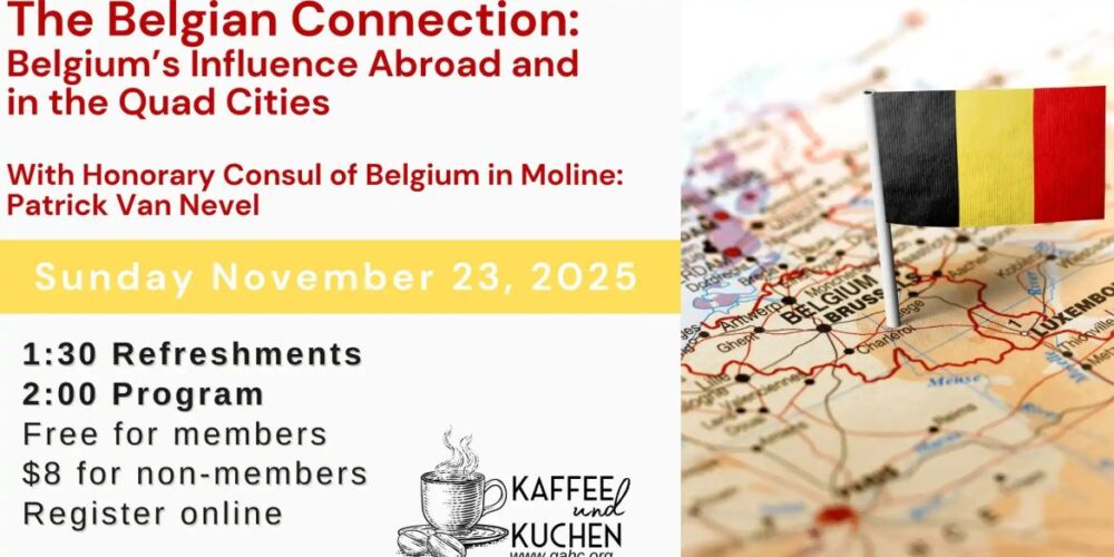 In the latest program in the German American Heritage Center’s popular “Kaffee und Kuchen” series, Honorary Consul Patrick Van Nevel will be discussing Belgium’s role in the founding and expansion of the European Union, as well as Belgian immigration to the Quad Cities from 1850 to 1920, in The Belgian Connection: Belgium’s Influence Abroad & in the Quad Cities, presented at the Davenport venue on November 23.