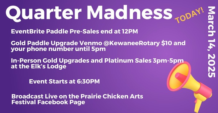 Severe weather concerns may have Kewanee residents rethinking their plans to attend the Quarter Madness Fundraiser tonight. For those hesitant to face the elements, there’s the opportunity to upgrade your gold paddle to a platinum one for $10, allowing you to join from home. Available today, March 14th, from 3 to 5 PM at the Elk’s Lodge, this option offers a convenient way to participate in the event, starting promptly at 6:30 PM. You can upgrade your Gold Paddle by Venmo @KewaneeRotary for $10 until 5 PM; include your name and phone number. The fundraiser will be streamed live on the Kewanee Prairie Chicken Arts Festival Facebook page, ensuring everyone can enjoy the festivities while staying safe indoors.