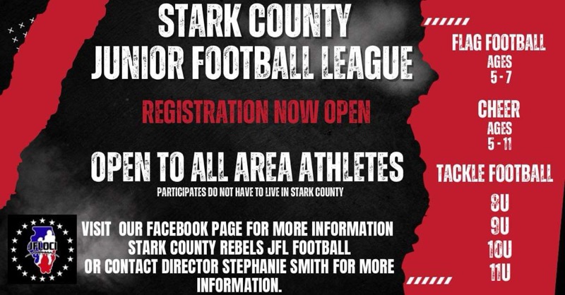 HomeNewsLocalRegistration is Open for Stark County Junior Football LeagueRegistration is Open for Stark County Junior Football LeagueMon, July 15, 2024 by Jennifer RussellSHARE NOW Registration is open for all area athletes who want to join the Stark County Junior Football League. Use this form to register here or visit the Facebook page here. Living in Stark County is not a requirement.