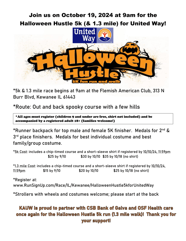 On October 19, 2024, Kewanee, Illinois, will host the Halloween Hustle 5K and 1.3-mile fun walk at the Flemish American Club on North Burr Boulevard. This event, supporting United Way, welcomes participants of all ages to enjoy a spooky-themed course. Whether you’re in it to compete or just for a stroll, the event promises fun for everyone with costume prizes and awards for the top finishers. Early registration offers discounted fees, encouraging participants to sign up quickly to take advantage of the savings. Don’t miss out on this festive opportunity to support a great cause! Register yourself or your kids here.