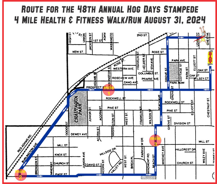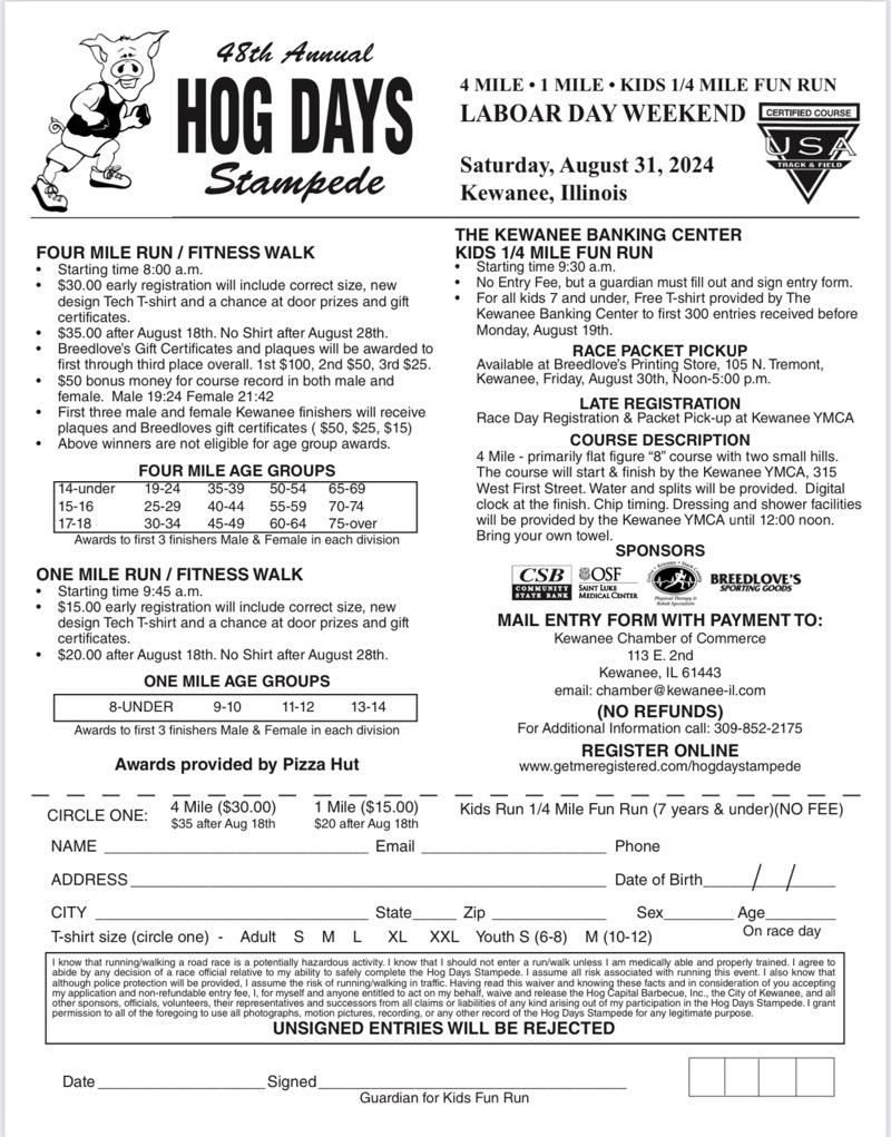 Registration is open for the 48th Annual Hog Days Stampede. You can choose the four-mile run, the one-mile run, or the kid’s run. There are awards for the first three male and female kids in each age group. The age groups are 8 and under; 9–10; 11–12; and 13–14. The kid’s race starts at 9:30 AM and there is no entry fee, but a guardian must fill out and sign the entry form, for kids 7 and under. A Free T-shirt is provided by The Kewanee Banking Center for the first 300 entries received. There is no guarantee of the correct size for entries received after Saturday, August 17th.