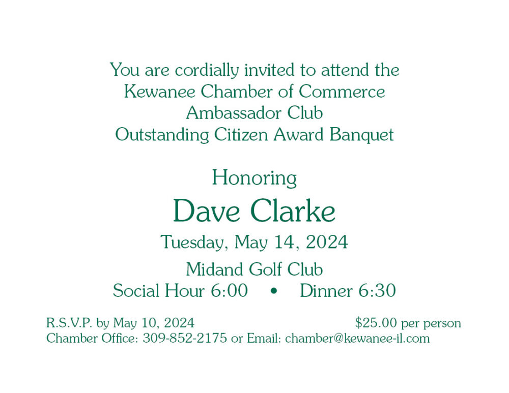Join us at the Outstanding Citizen Award Banquet for our dear friend Dave Clarke on Tuesday, May 14, 2024, at 6 PM.  The Kewanee Chamber of Commerce Ambassador Club is accepting reservations for the Outstanding Citizen Award banquet honoring, Dave Clarke, at the Midland Golf Club.  Read about Outstanding Citizen Dave Clarke here. Reserve your spot by May 10th at 309-852-2175 or [email protected].  The cost is $25 per person.  The social hour begins at 6 PM and dinner is served at 6:30 PM.