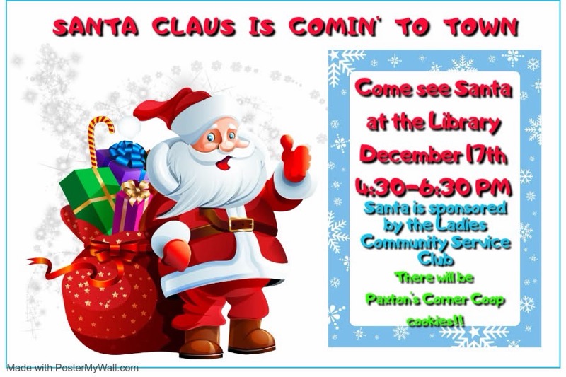 Santa will pay a visit to Annawan this week! On December 17th, from 4:30 to 6:30 PM, Santa will be at the Annawan-Alba Township Library. Don’t miss out on a last minute visit with Santa and picture opportunity for your children. There will also be cookies from Paxton’s Corner Coop.