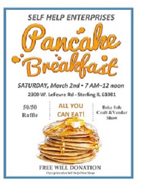 Attend the all-you-can-eat Pancake Breakfast on Saturday, March 2nd from 7 AM until noon. The event will take place at 2300 West LeFevre Road, Sterling, Illinois. Get involved in the 50/50 raffle, purchase goods from the bake sale, or peruse the craft and vendor show. No set admission fee, instead a free-will donation is suggested. This community event is sponsored by Self Help Enterprises.