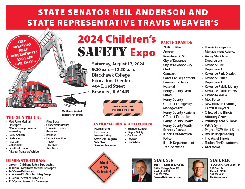 State Senator Neil Anderson and State Representative Travis Weaver are hosting the 2024 Children’s Safety Expo on Saturday, August 17, from 9:30 AM to 12:30 PM at Blackhawk College’s Educational Center in Kewanee. The event includes a ‘Touch a Truck’ feature with various emergency and utility vehicles, educational demonstrations, and activities focused on child safety. Admission and refreshments are free, along with giveaways for attendees. Around 20 vehicles are registered for the ‘Touch a Truck’ event, including the MedForce Medical Helicopter. More than 30 agencies will have booths available for information, education, and activities for the kids. Don’t miss out on demonstrations by the MedForce Helicopter, Patti’s Gym, the Flip Flops Tumbling Group, and Kewanee’s K9 Maverick.