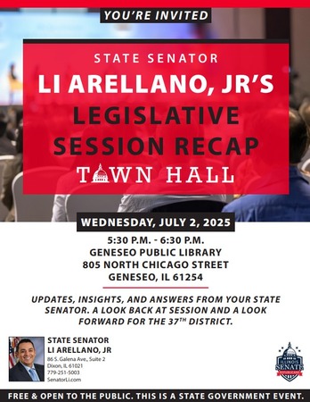 State Senator Li Arellano, Jr., will mark the opening of his new district office in Geneseo with a ribbon-cutting ceremony on Wednesday, July 2, 2025. The celebration, hosted by the Geneseo Chamber of Commerce, will take place at the Geneseo Municipal Building from 3:45 to 4:45 PM. Later that evening, Senator Arellano will hold a Legislative Session Recap Town Hall at the Geneseo Public Library from 5:30 to 6:30 PM. Residents will have the opportunity to learn about recent legislative decisions and express their views on pressing state and local concerns.